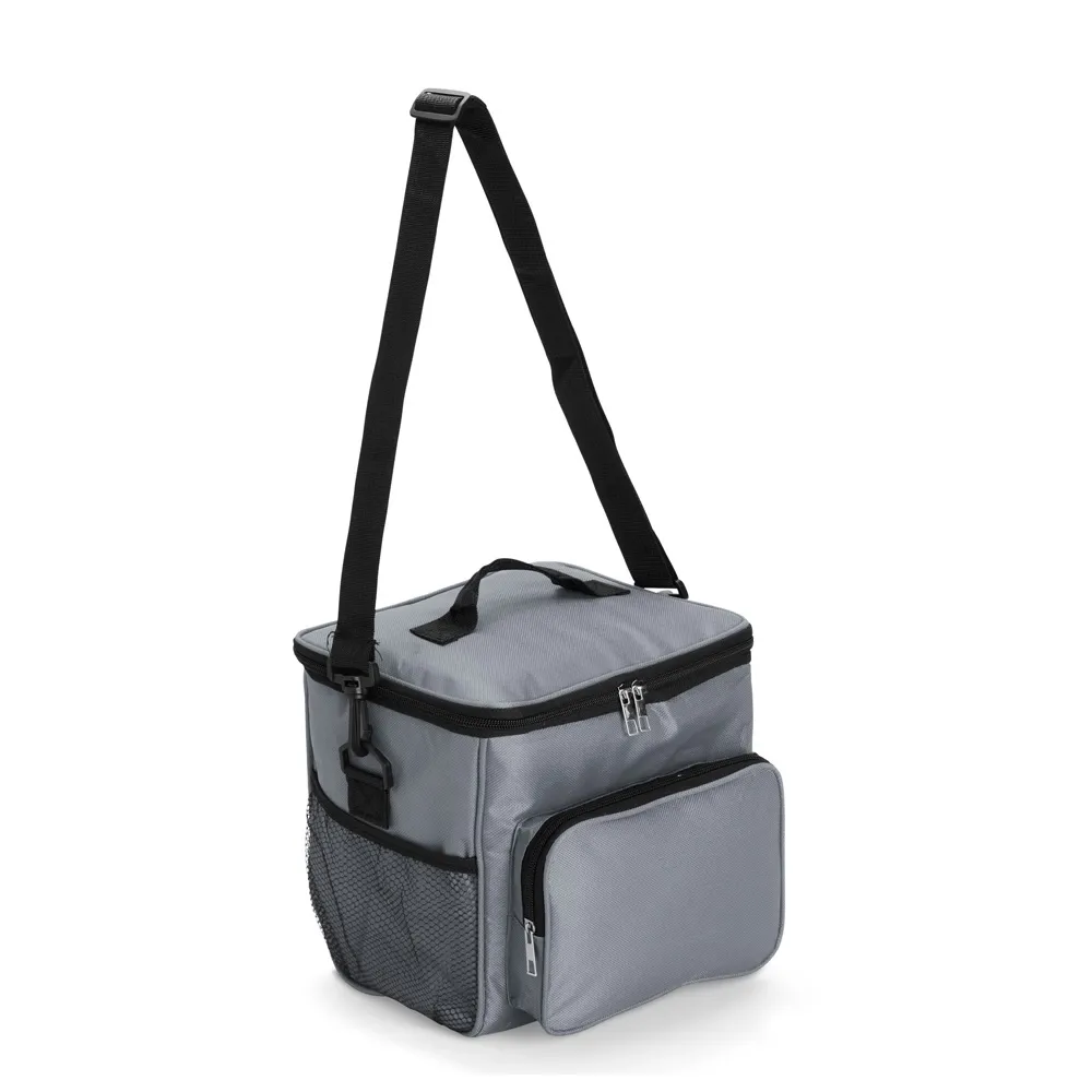 Bolsa térmica em Oxford resistente à água e com capacidade de até 11 litros. Seu revestimento interno em alumínio permite a conservação de temperatura de alimentos e bebidas por mais tempo. Possui também um bolso frontal e mais um par de bolsos laterais em tela de nylon, além de uma alça fixa na tampa e outra transversal.