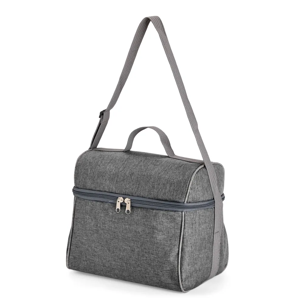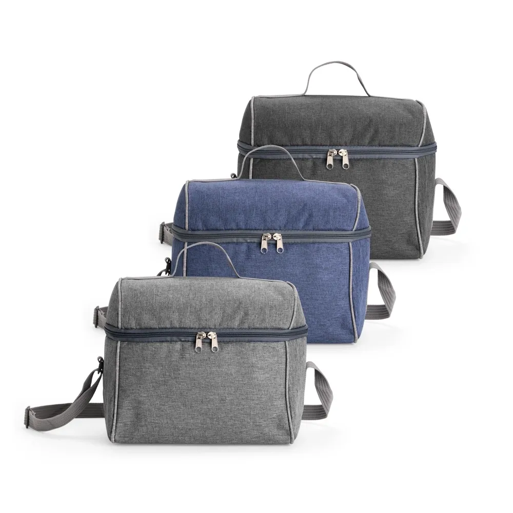 Bolsa térmica confeccionada em poliéster resistente à água, com capacidade máxima de 14 litros e fechamento em zíper. Possui revestimento térmico interno em PVC laminado prata verniz, que ajuda a conservar a temperatura de alimentos e bebidas por mais tempo. Além disso, conta com uma alça fixa na tampa e outra transversal ajustável.