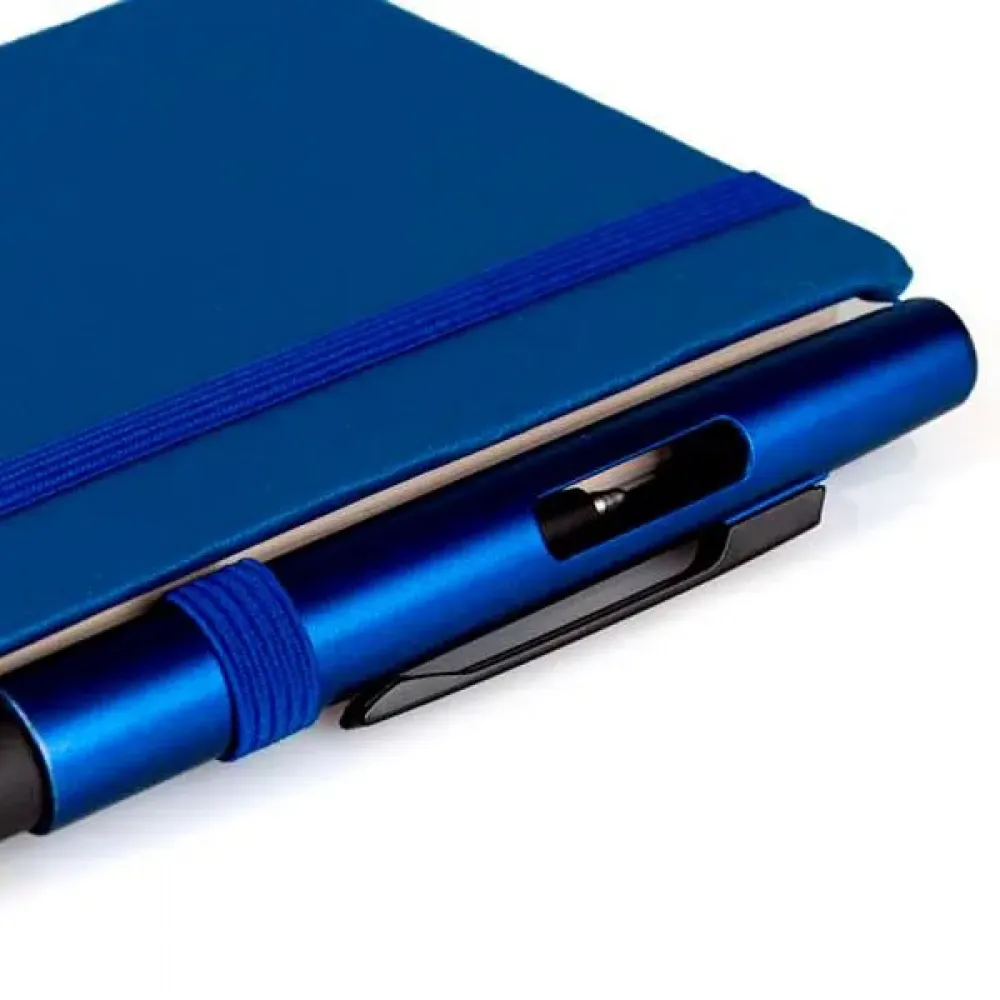 Caderno para anotações azul com capa dura. Conta com 80 folhas pautadas, marcador de página, porta caneta e elástico para fechamento. Gramatura da folha de 70 g/m2. Tipo de gravação: Uma gravação em Silkscreen na capa. Dimensões do produto: 12,2x17 cm Dimensões da embalagem: 127x177x15 mm (AxLxP) Peso da embalagem: 224 g Embalagem do produto: Caixa Preta