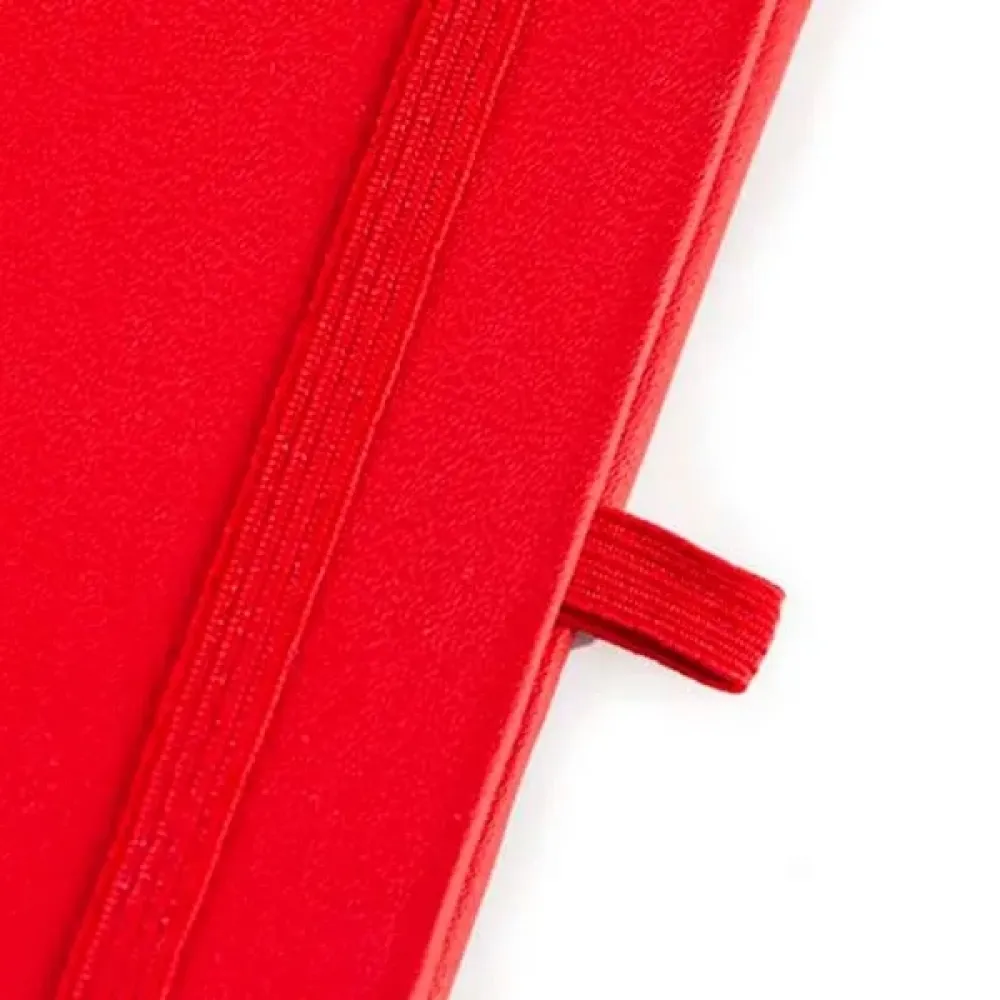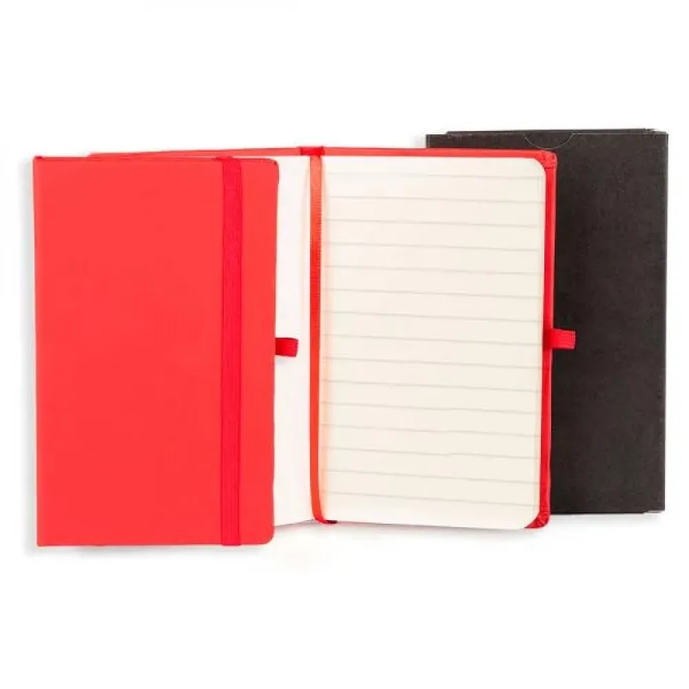 Caderno para anotações vermelho com capa dura. Conta com 80 folhas pautadas, marcador de página, porta caneta e elástico para fechamento. Gramatura da folha de 70 g/m2. Tipo de gravação: Uma gravação em Silkscreen na capa. Dimensões do produto: 14x21 cm Dimensões da embalagem: 155x215x18 mm (AxLxP) Peso da embalagem: 296 g Embalagem do produto: Caixa Preta