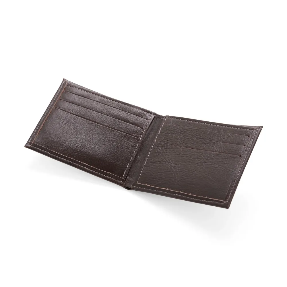 Carteira em couro com design compacto e sem fechamento. Possui seis divisórias internas para cartões e documentos e um compartimento para cédulas.