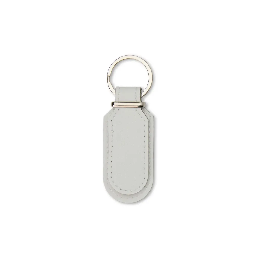 Chaveiro de couro sintético com detalhe em metal e frente e verso lisos.