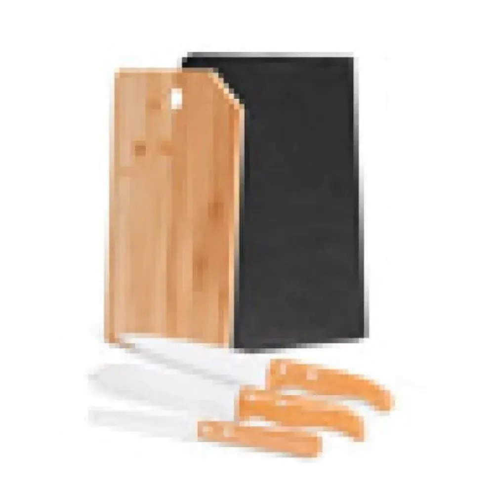 Kit para Cozinha em Bambu/Inox. Composto por tábua em Bambu com furo; faca 7, faca Santoku em Bambu/Inox. Composto também por faca 4" para frutas em Madeira/Inox. Como cortesia, na faca 7" fazemos uma gravação com os cortes do boi. Tipo de gravação: Uma gravação a Laser na tábua e na lâmina da faca 7". Dimensões do produto: Tábua: 32x17x1,2cm Dimensões da embalagem: 373x180x43 mm (AxLxP) Peso da embalagem: 738 g Embalagem do produto: Caixa Preta