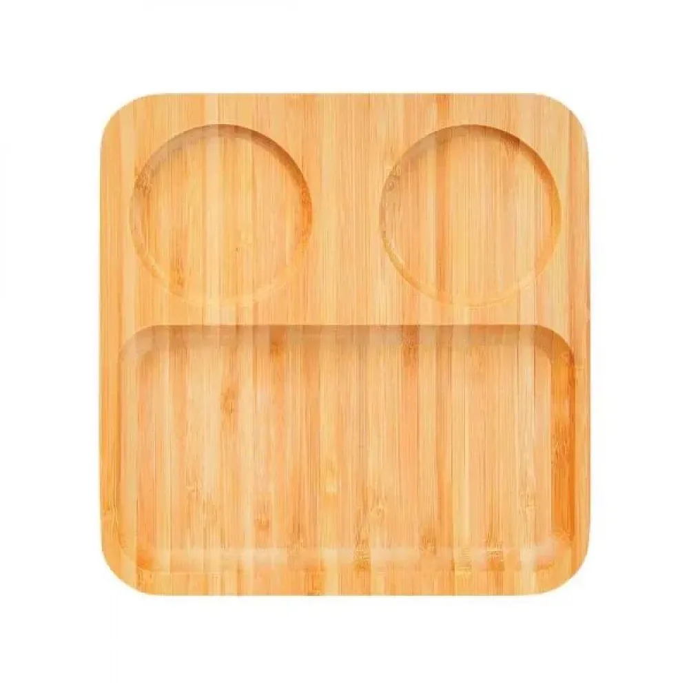 Conjunto para petiscos e patês em Bambu/Fibra de bambu. Acompanha dois potes em fibra de bambu, base e duas espátulas de 14cm em bambu. Tipo de gravação: Uma gravação a Laser na base. Dimensões do produto: Base: 21,5x21cm / Pote: 9,5x3cm (cada) Dimensões da embalagem: 220x220x50 mm (AxLxP) Peso da embalagem: 580 g Embalagem do produto: Caixa Preta