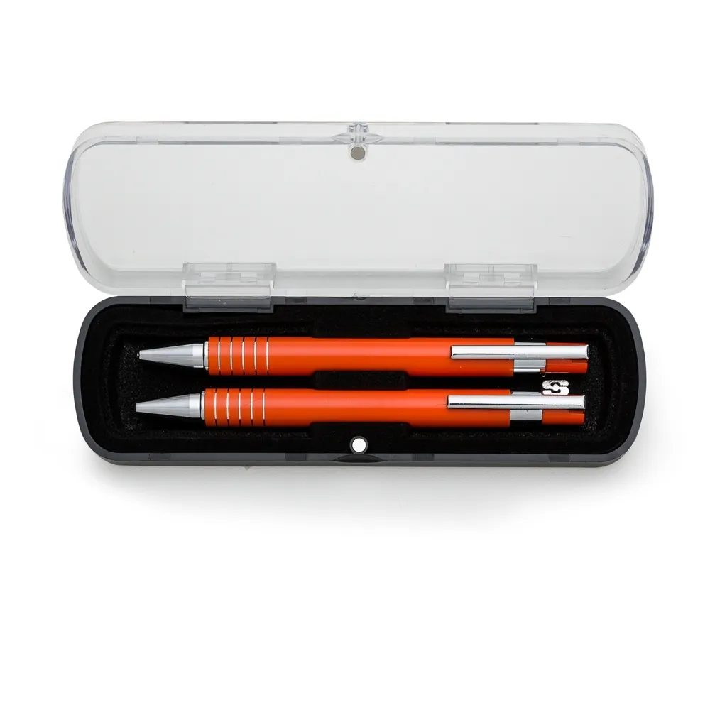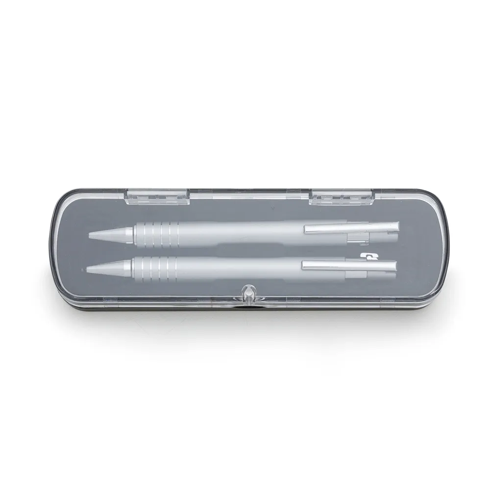 Caneta e Lapiseira semimetal em estojo de acrílico com detalhe plástico. Caneta e lapiseira com clip de metal, suporte do acionador com anel plástico e cinco anéis prata na parte inferior, acionam por clique. Estojo revestido de veludo interno e com suporte/encaixe para fixar as peças dentro, estojo de imã. OBS.: PEDIDO APENAS MÚLTIPLO DE 50 PEÇAS!