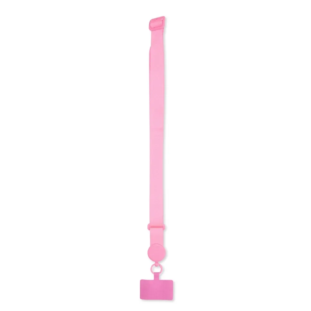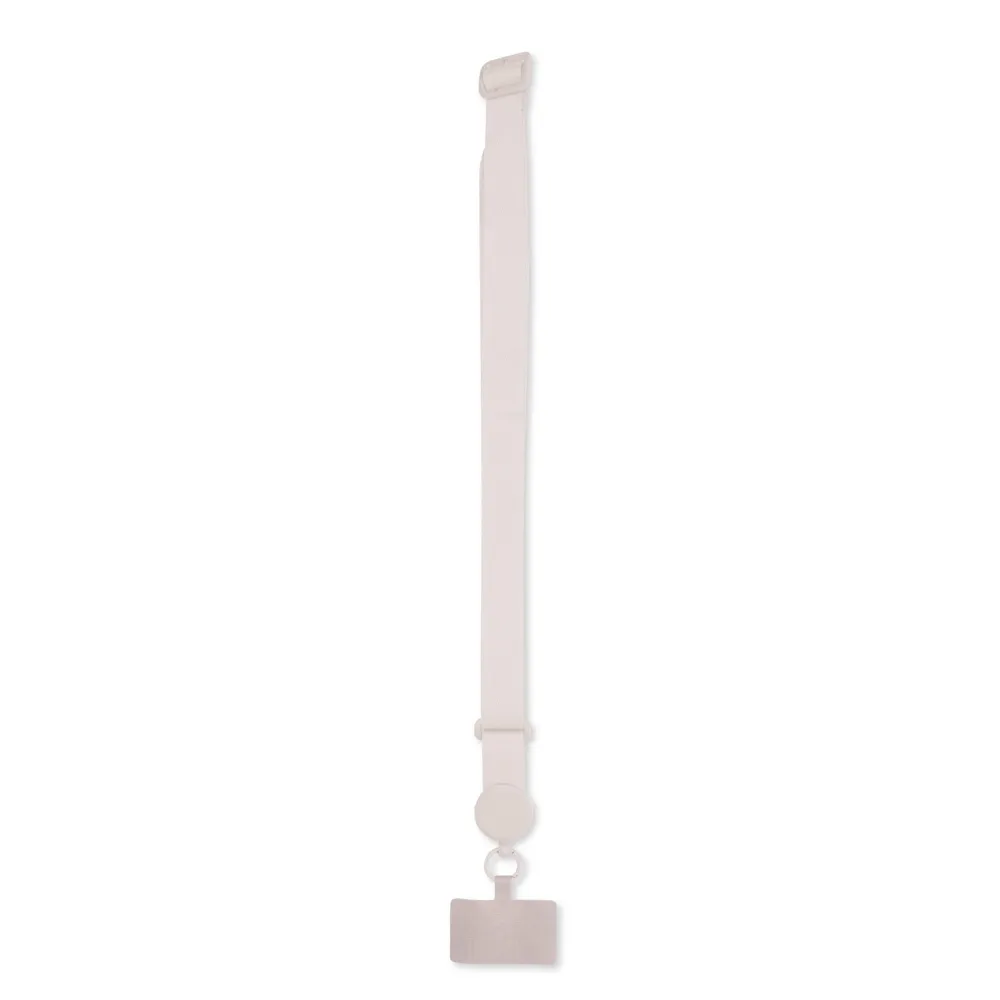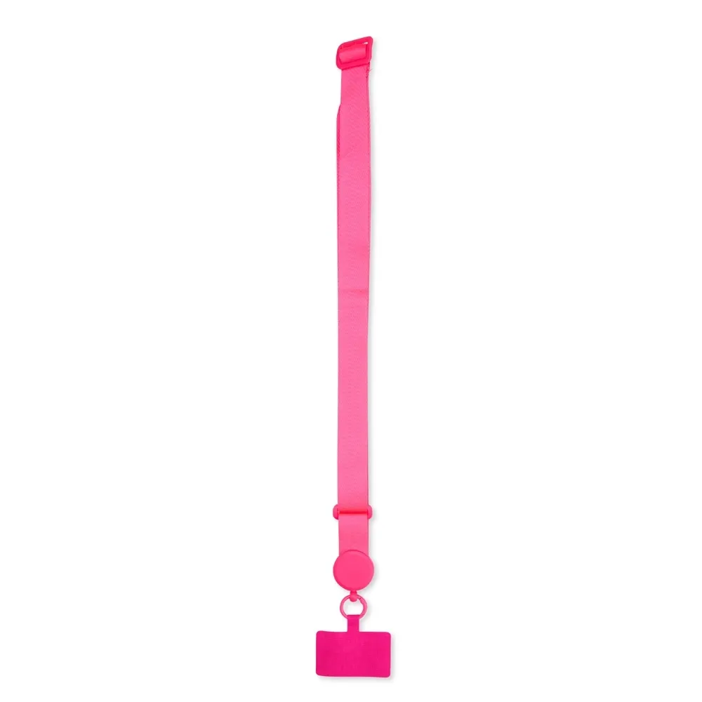 Cordão com alça ajustável para celular feito em poliéster. O acessório é fixado a um cartão retangular que se encaixa na parte interna da capa do celular, próximo à entrada de carregamento USB.