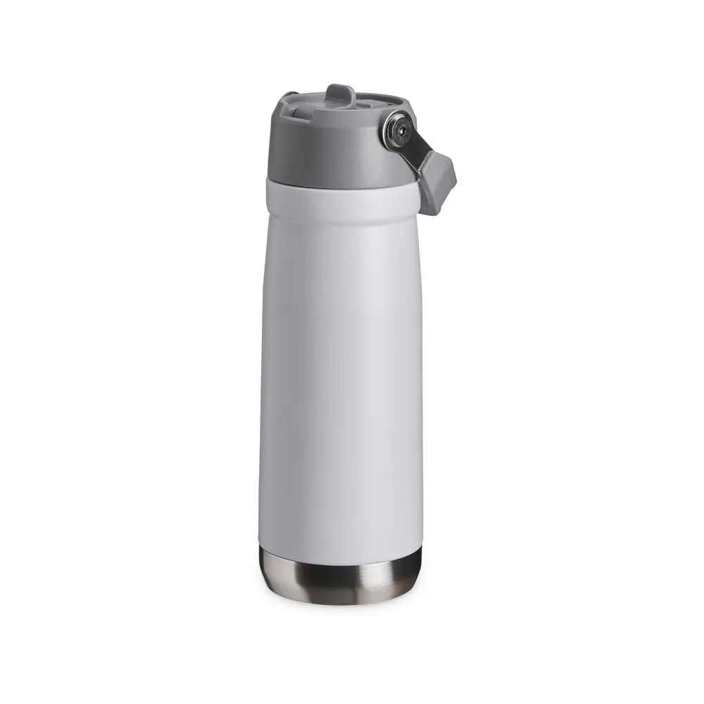 Garrafa térmica de parede dupla em inox, capacidade de 700ml. Tampa com alça de transporte, bico flip e canudo interno.