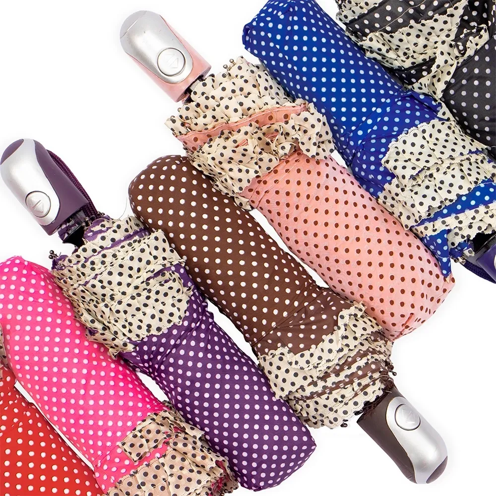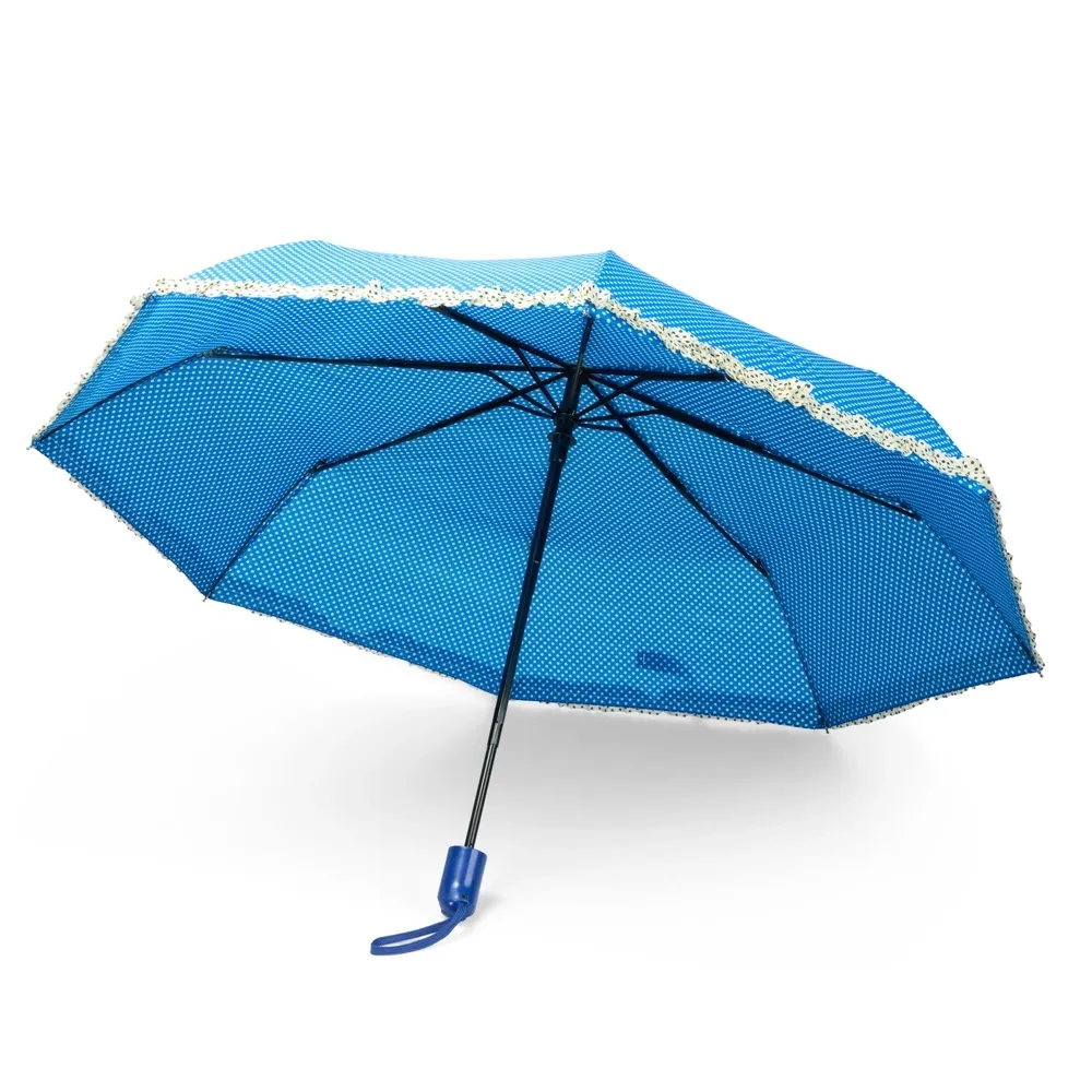 Guarda-chuva em poliéster com abertura automática por acionamento de botão. Possui estrutura metálica com oito varetas e pegador em plástico com alça de nylon fixa na ponta. Acompanha capa protetora.