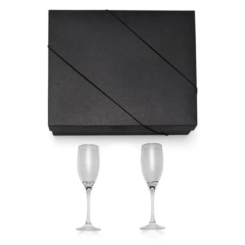 Jogo com 2 taças de vidro para Champagne, com espaço para a garrafa baby (NÃO ACOMPANHA GARRAFA). Capacidade das taças: 190ml cada Tipo de gravação: Uma gravação a Laser nas duas taças. Dimensões do produto: Taça/capacidade: 190ml Dimensões da embalagem: 364x300x98 mm (AxLxP) Peso da embalagem: 795 g Embalagem do produto: Caixa Preta