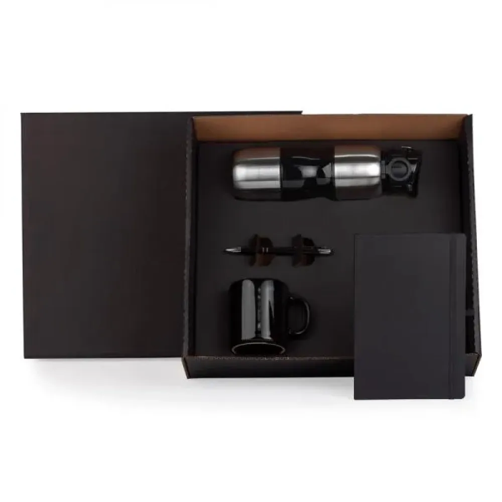 Kit boas vindas. Conta com garrafa 750ml revestida em aço inox; caneca em ceramica 270ml; caderneta sem pauta; caneta esferográfica em aluminio com ponta touch. Tipo de gravação: Uma gravação a laser na garrafa e Silk na caneca. Dimensões do produto: Squeeze: 26x7Øcm Dimensões da embalagem: 395x347x120 mm (AxLxP) Peso da embalagem: 1.301 g Embalagem do produto: Caixa Preta