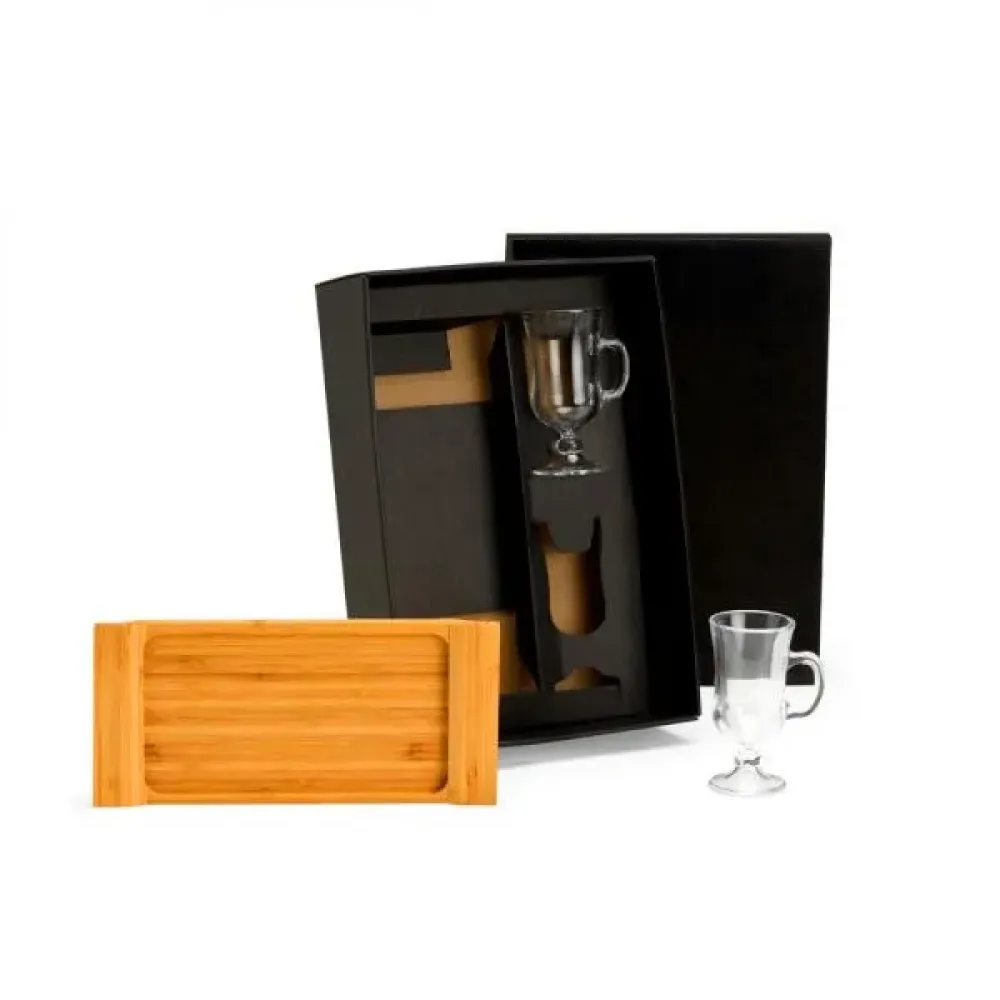 Kit para cafézinho; Conta com bandeja em bambu; Duas canecas em vidro 130ml cada. Estão perfeitamente acomodados em uma caixa para presentear. Tipo de gravação: Uma gravação a Laser na bandeja e nas canecas. Dimensões do produto: Bandeja: 28x13x2,5cm Dimensões da embalagem: 350x240x85 mm (AxLxP) Peso da embalagem: 950 g Embalagem do produto: Caixa Preta