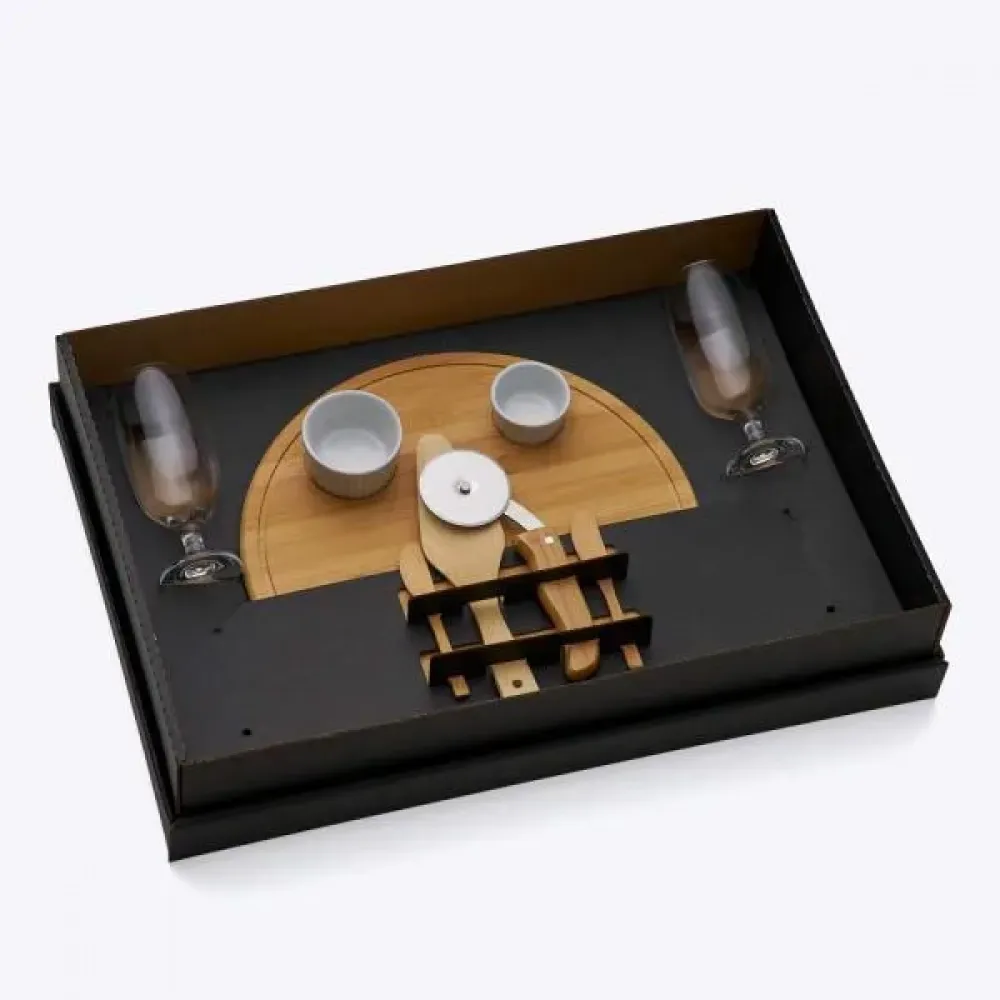 Conta com tábua, espátula para pizza, 2 espátulas pequenas, cortador de pizza em bambu/inox, 2 taças em vidro e 2 ramekins em porcelana. Tipo de gravação: Uma gravação a Laser nas duas taças e na tábua. Dimensões do produto: Tábua: 35x1,2cm Dimensões da embalagem: 580x395x120 mm (AxLxP) Peso da embalagem: 1.884 g Embalagem do produto: Caixa Preta