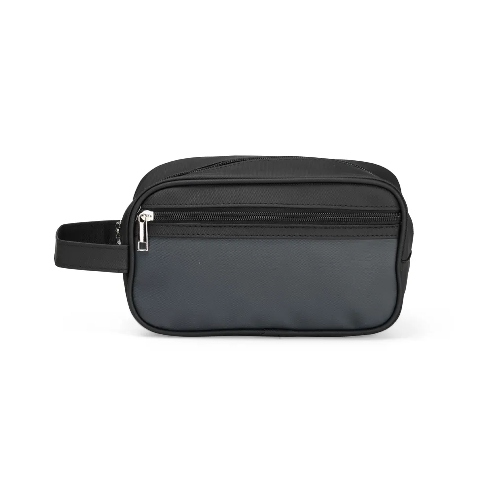Nécessaire em couro sintético impermeável com fechamento em zíper. Possui bolso frontal também com zíper e alça lateral de mão.