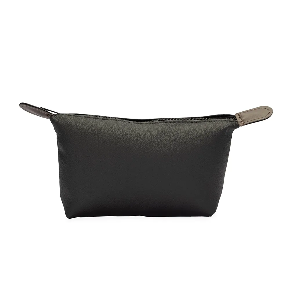Nécessaire em couro sintético impermeável e fechamento em zíper e detalhe frontal metálico.