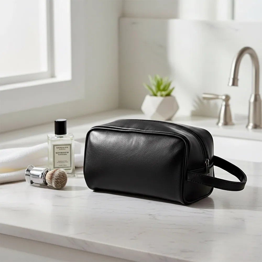 Nécessaire confeccionada em poliuretano (PU) liso impermeável com fechamento em zíper e alça lateral para transporte.