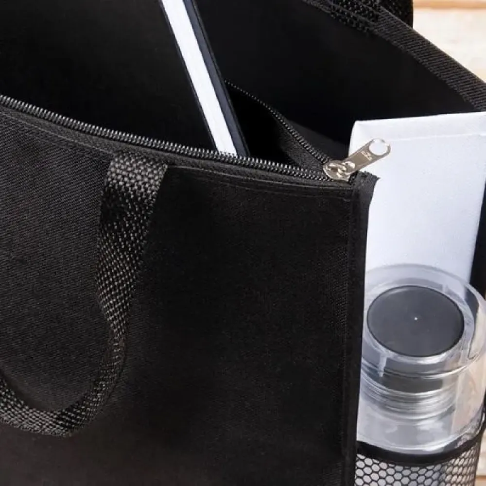 Sacola de mão em nylon 600 preta/branca. Conta com alça, tela lateral, compartimento duplo, sendo um com fechamento em zíper. Tipo de gravação: Uma gravação em Silk Screen. Dimensões do produto: 30x37cm (com alça e aberto 30x56x11,5cm) Dimensões da embalagem: 300x370x0 mm (AxLxP) Peso da embalagem: 190 g Embalagem do produto: Plástica embalada de 10 em 10